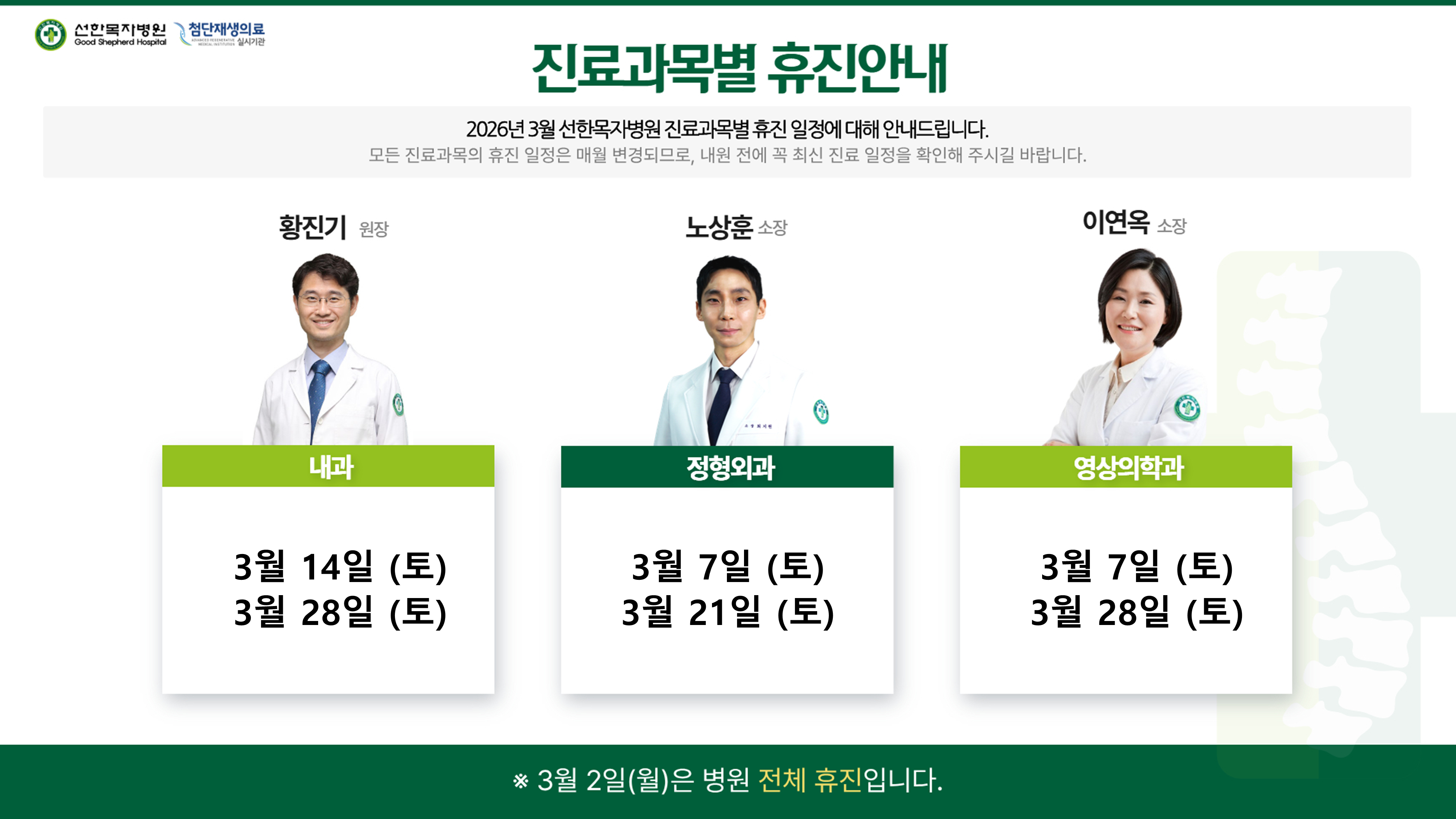 2026년 3월 진료과목별 휴진 안내 (3월 2일 월요일 - 대체공휴일로 병원 전체 휴진)