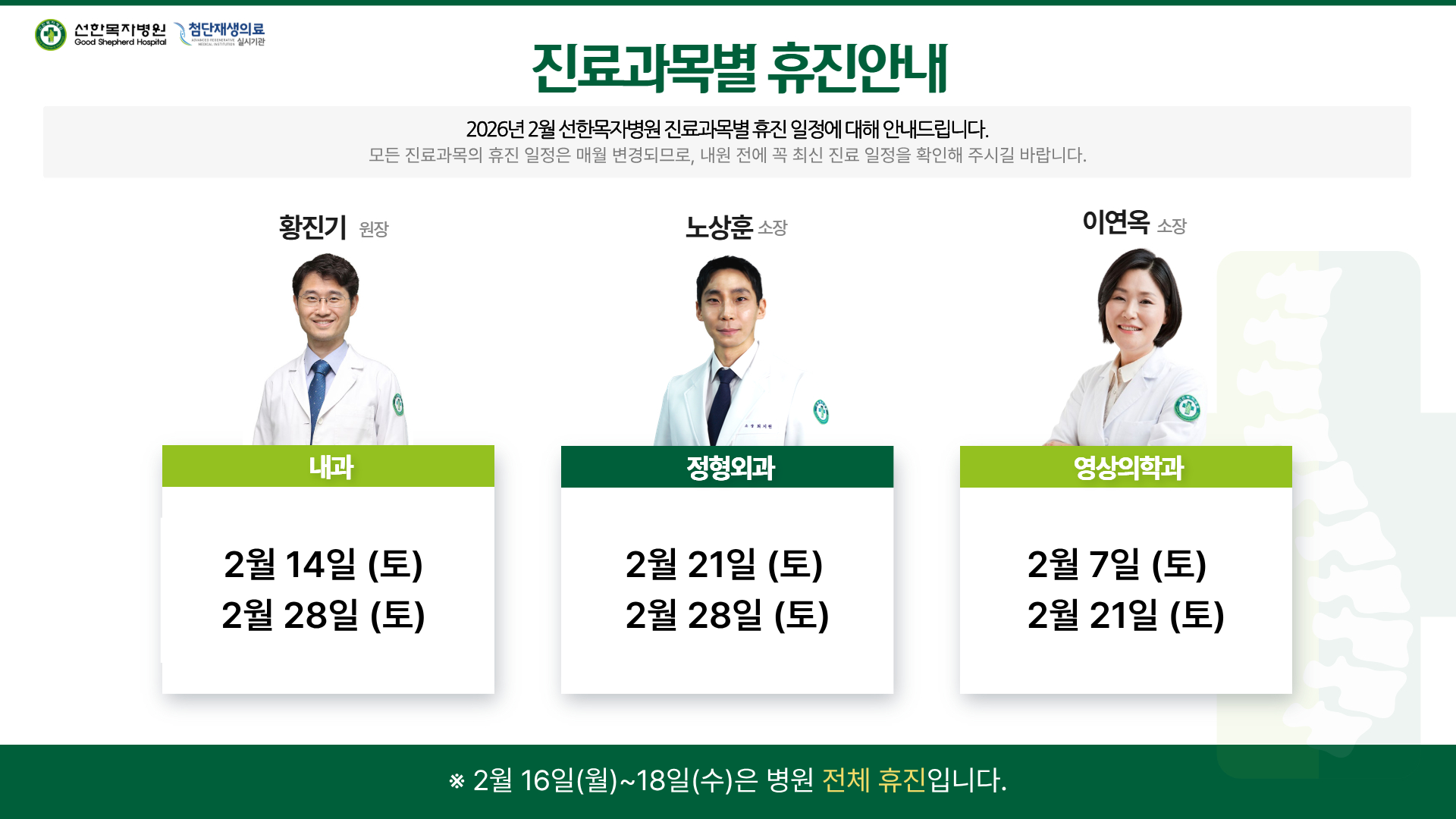 2026년 2월 진료과목별 휴진 정보를 안내해 드립니다.